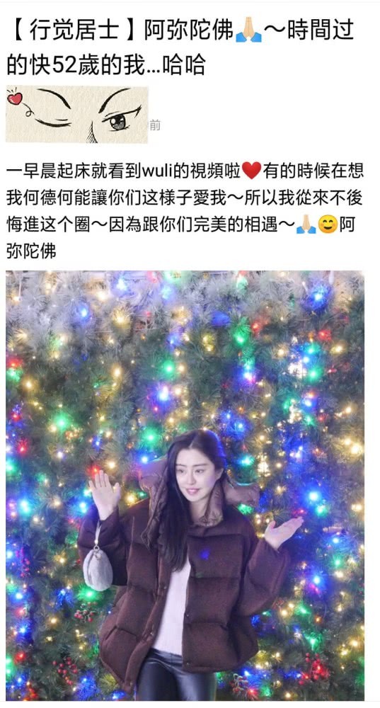 “有的时候在想我何德何能让你们这样子爱我~所以我从来不后悔进这个圈~因为跟你们的完美相遇~阿弥陀佛。”