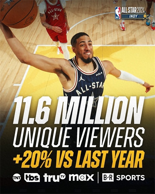 2月21日消息,NBA官方发布了本届全明星正赛在全美范围的收视数据。数据显示,共有1160万观众通过TNT、TBS、truTV、B/R Sports和Max平台收看本次赛事,同比增长20%。