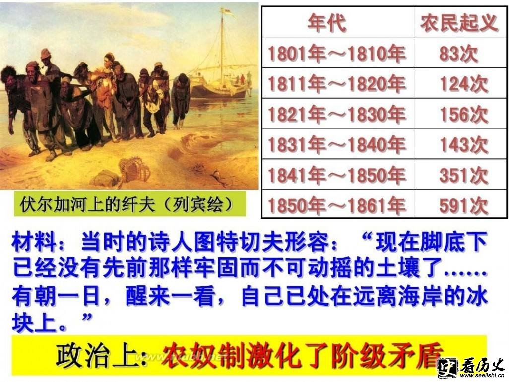 思想:西方资产阶级思想进一步影响俄国社会,越来越多的俄国百姓看到了农奴制社会与资本主义社会之间的差距,为了追求更好的生活,人们纷纷要求改革,以资本主义形式来实现社会的发展。