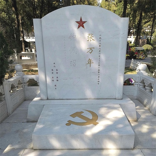 墓碑的正面,刻有张万年上将金色名字及其生辰和卒年,即生于1928年8月1日,2015年1月14日去世。另一侧刻有上将夫人的名字钟佩昭,生于1935年8月8日,但没有“描色”。按照传统,名字描金字是对逝者的尊敬,红色或无色表示生者。但各地风俗不一。