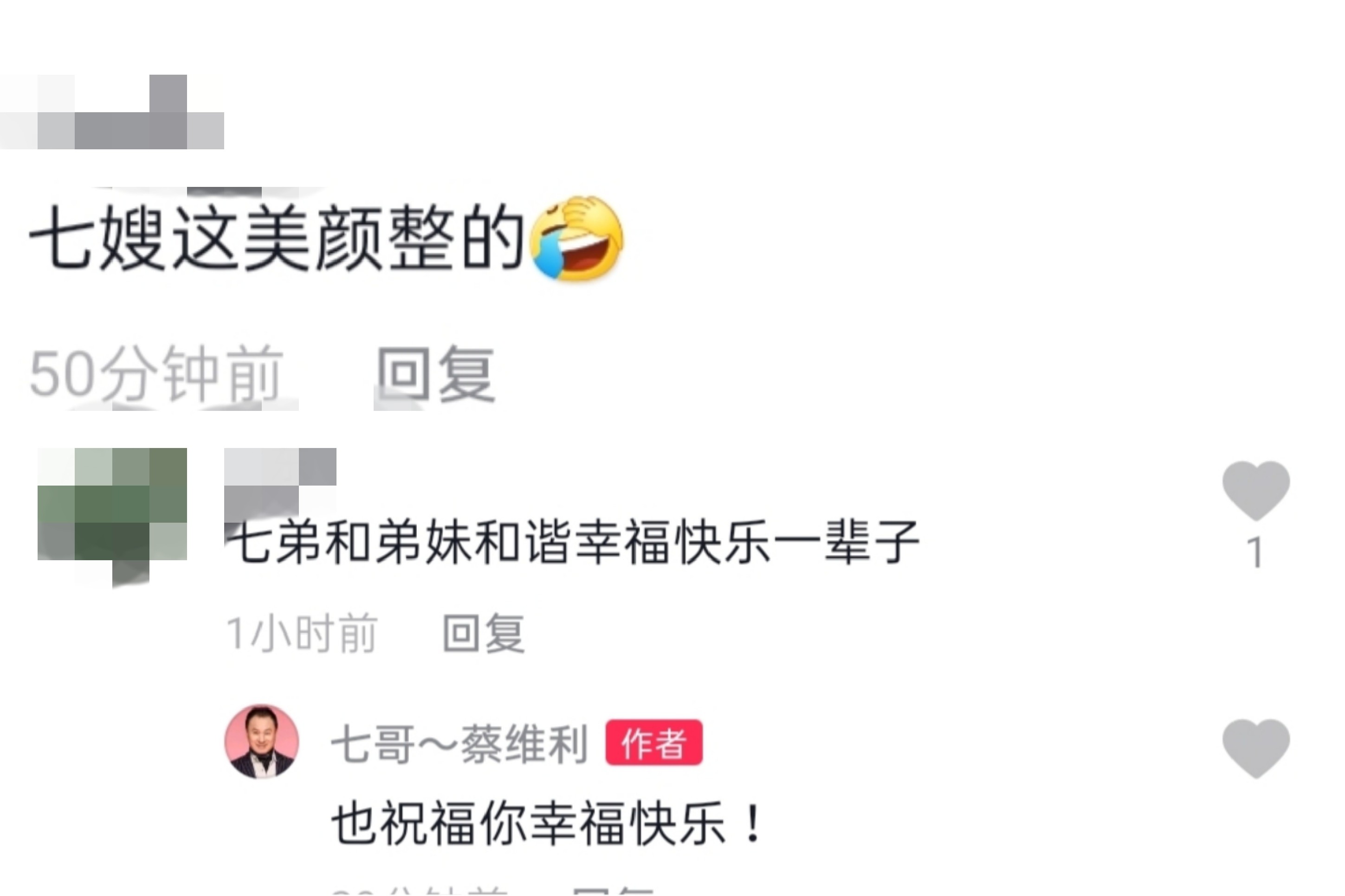 两个人同框的画面也受到了不少网友的祝福,有网友表示“七弟和弟妹和谐幸福快乐一辈子”,还得到了蔡维利本人的回复,不过也有网友调侃视频美颜太夸张。