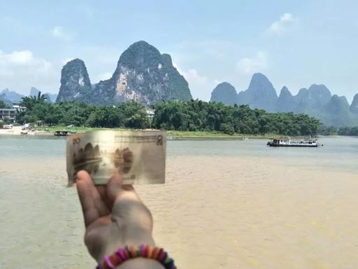 拿来朋友手中的二十元人民币,正是这里。真秀美啊,爱你,桂林的山,还有那边清亮的水!