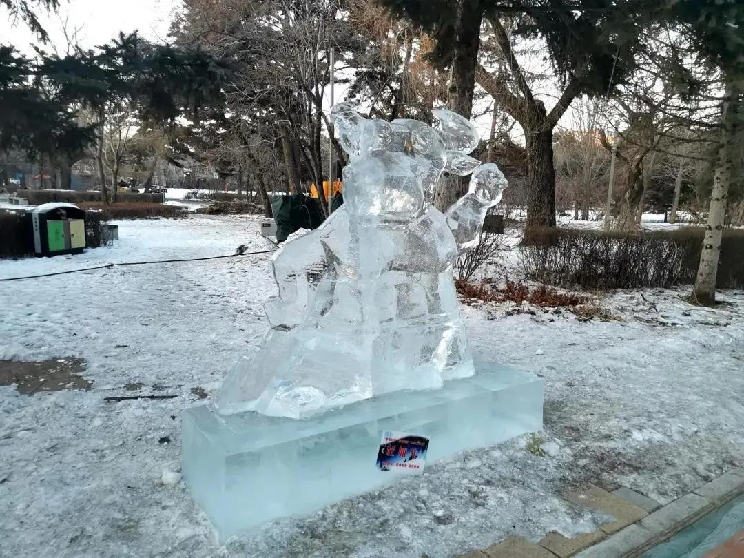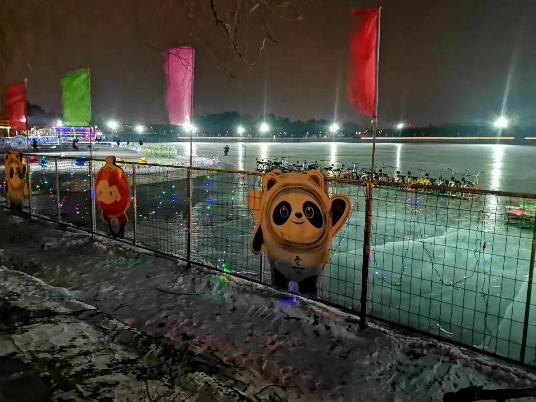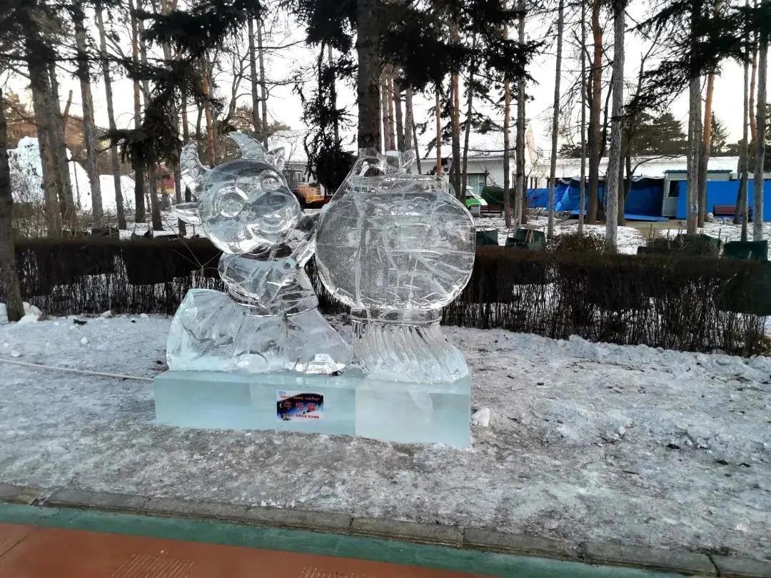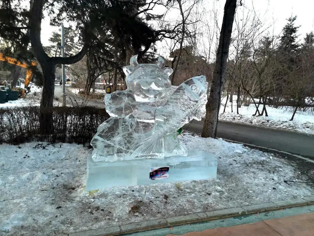走在南湖公园的路上,还会发现两旁的冰雕晶莹透亮,落日的余晖散落其间,烁烁放光。将中国传统文化与现代卡通造型相融合,完美地体现出了纯朴、厚重、吉祥、快乐的艺术品质,令人忍不住赞叹。
