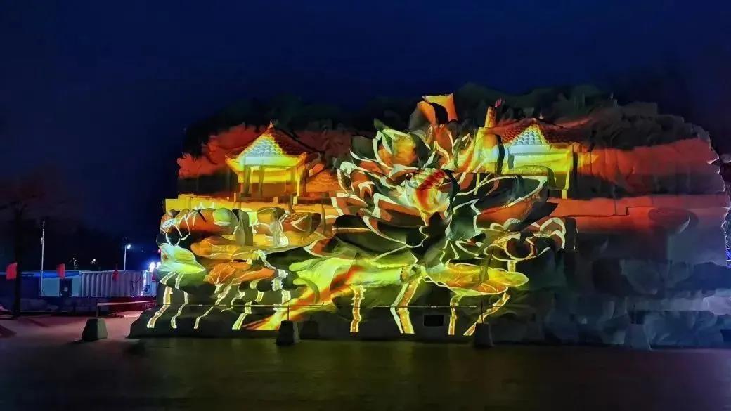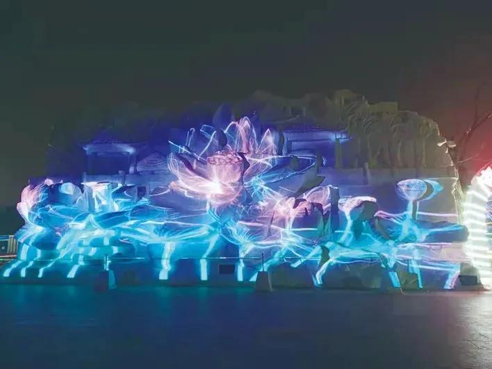 今年该园采用3D全息投影技术妆点《荷美》大型雪雕作品,通过多元素展现荷花景色,结合动感的绚丽和跳动的画面,表现南湖公园冬季的绚丽和娇美,并且突出“和和美美”这一含义。