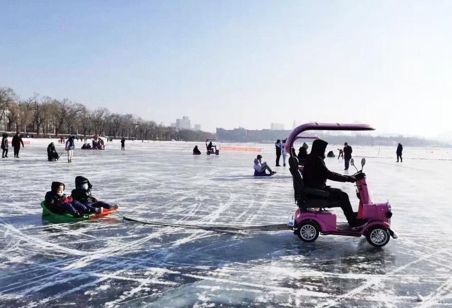 在南湖公园除了有好看的冰灯外,还有冰雪乐园可以尽情玩耍~冰上活动项目大概包括5大类、14小项,共设滑冰场多处、冰上电动车多处、冰上爬犁场多处、冰上自行车场多处、冰上雪滑梯多处。