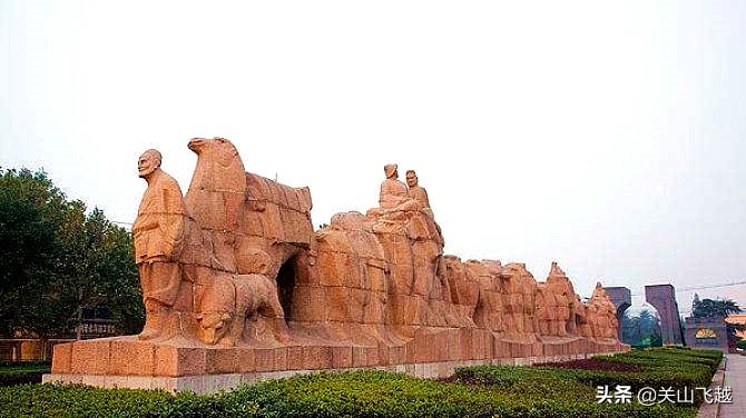 丝绸之路是起始于古代长安,也就是今天的西安。在西安市玉祥门外,矗立着一座“丝绸之路”巨型石雕,画的是跋涉于丝绸之路上的一队骆驼商旅,这座石雕,将丝绸之路上长达一千多年的各国商贸往来的历史高度概括的表现出来,展示出一支西域驼队满载丝绸、瓷器、茶叶等即将西行的浩大场景。