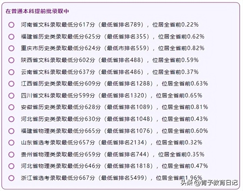 河南省文科录取最低分617分(最低省排名789),位居全省前0.22%;福建省历史类录取最低分625分(最低省排名355),位居全省前0.62%;福建省物理类录取最低分665分(最低省排名1076),位居全省前0.60%;山东省选考录取最低分657分(最低省排名2134),位居全省前0.32%;浙江省选考录取最低分667分(最低省排名5499),位居全省前1.96%。