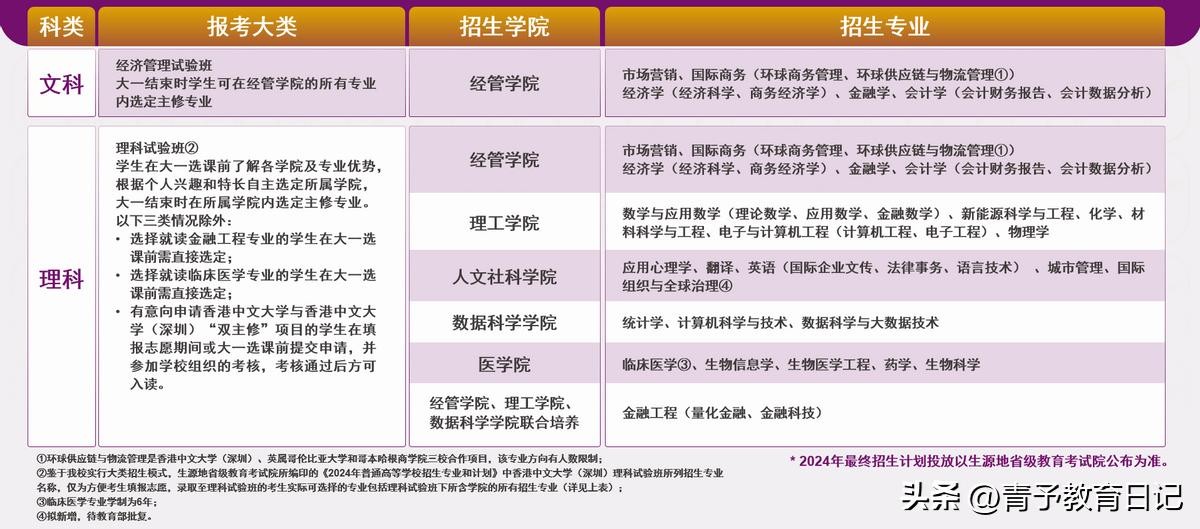 港中深有6大学院28个本科专业,报考时采用“大类招生”模式,考生在填报志愿阶段只需选择大类:“经济管理试验班”或“理科试验班”,入学后,在深入了解各学院及专业优势后,再选择具体专业且专业的招生名额不受限制。