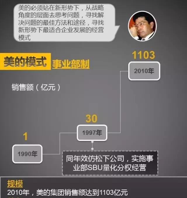 特色:美的集团从1998年开始效仿松下公司,全面推行事业部制改造,并形成了以“集权有道、分权有序、授权有章、用权有度”16字方针为核心的“事业部分权体制”,直接促成了美的的新一轮高速增长,2010年,美的集团销售额达到1050亿元。至今这套分权体制依然是美的集团核心竞争力的重要来源。
