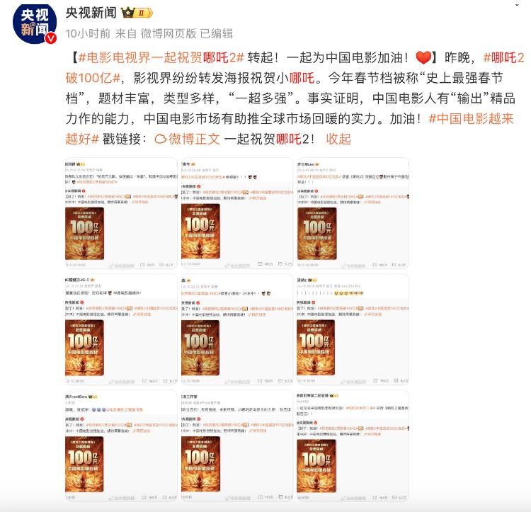 在《哪吒2》总票房破100亿元时,央视新闻、人民日报等央媒发文祝贺。包括贾樟柯、张艺谋等著名导演,贾玲、刘亦菲、张雨绮、宋茜、檀健次等多位艺人也纷纷转发祝贺。
