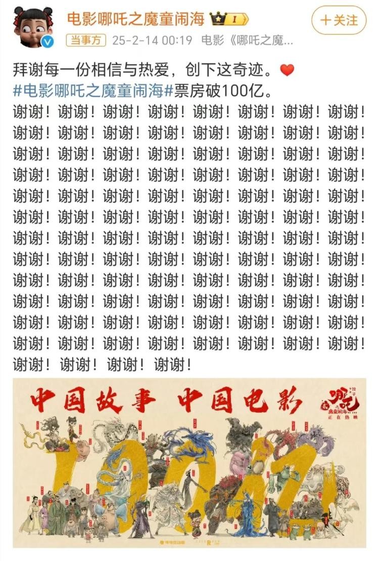 2月14日凌晨,《哪吒2》官方微博 连发100个谢谢,并配文称:拜谢每一份相信与热爱,创下这奇迹。