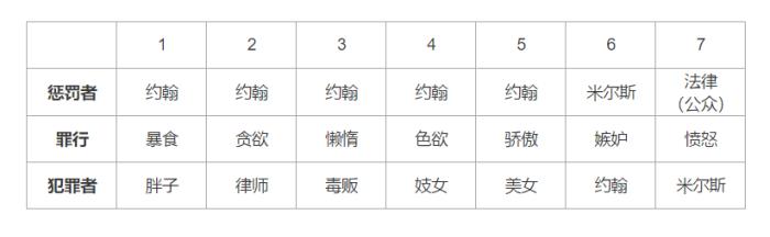为了方便理解,我将七宗罪的惩罚者,罪行与犯罪者做成表格罗列在下方。