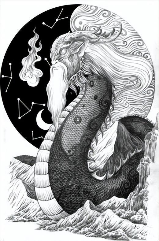 西北海外,赤水之北,有章尾山。有神人面蛇身而赤,直目正乘。其瞑乃晦,其视乃明, 不食,不寝,不息;风雨是谒,是烛九阴,是谓烛龙。(西北海的外面,赤水的北边,有一座章尾山。有一位神,长着人一样的脸,蛇一样的身子,浑身红色,眼睛竖着长,它闭上眼睛,天下就变成了黑夜;睁开眼睛,天下就成了白天。它不吃东西,不睡觉,也不呼吸,能请来风雨。它能照亮幽渺之地,这就是烛龙)”——摘自《山海经·大荒北经》