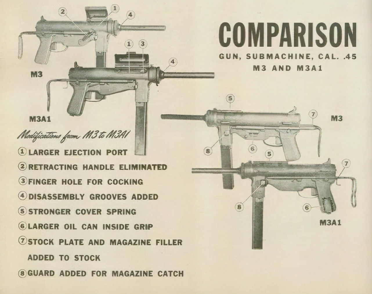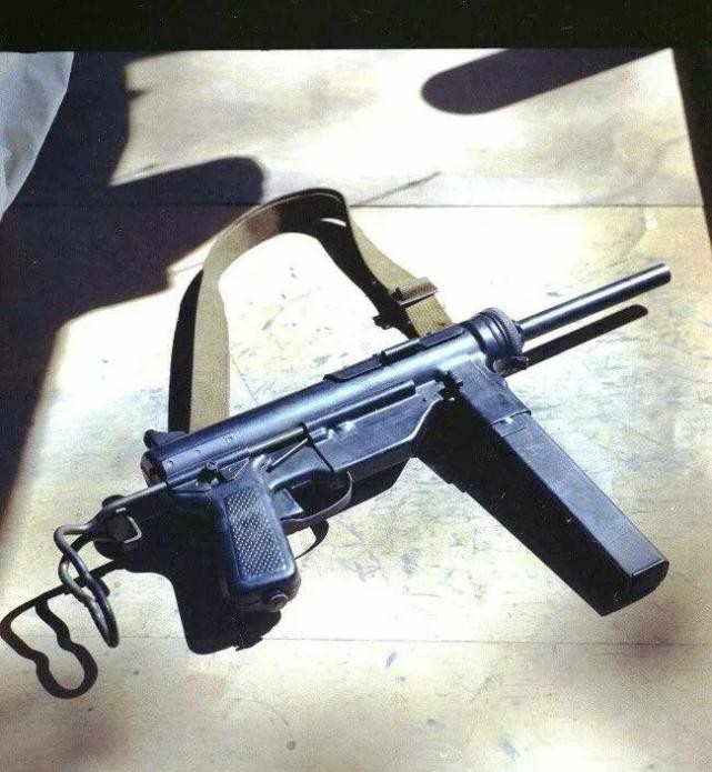 这款冲锋枪其实就是M3式11.43毫米冲锋枪,它是美国在二次大战初期开始研制生产的,并且广泛的运用到了二战的对法西斯作战的过程当中,它的口径为11.43毫米(0.45英寸),使用的弹药为11.43毫米X2ACP手枪弹,枪全长:745/570毫米,枪管长203毫米,整枪全重3.67千克,弹容量可以装填30发,射速为350~450发/分,有效射程200米。