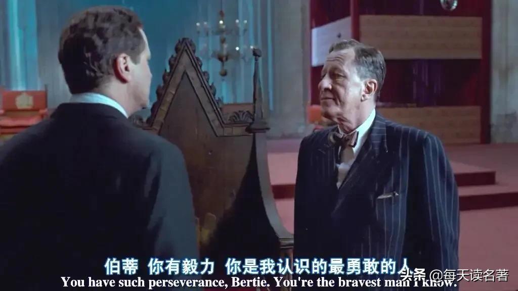 在他的循循善诱指导和鼓舞下,约克公爵化解心里的不安和畏难情绪,用自信洪亮的声音和激情澎湃的活力展现出一个国王的威严和气势,在二战前发表鼓舞人心的演讲!