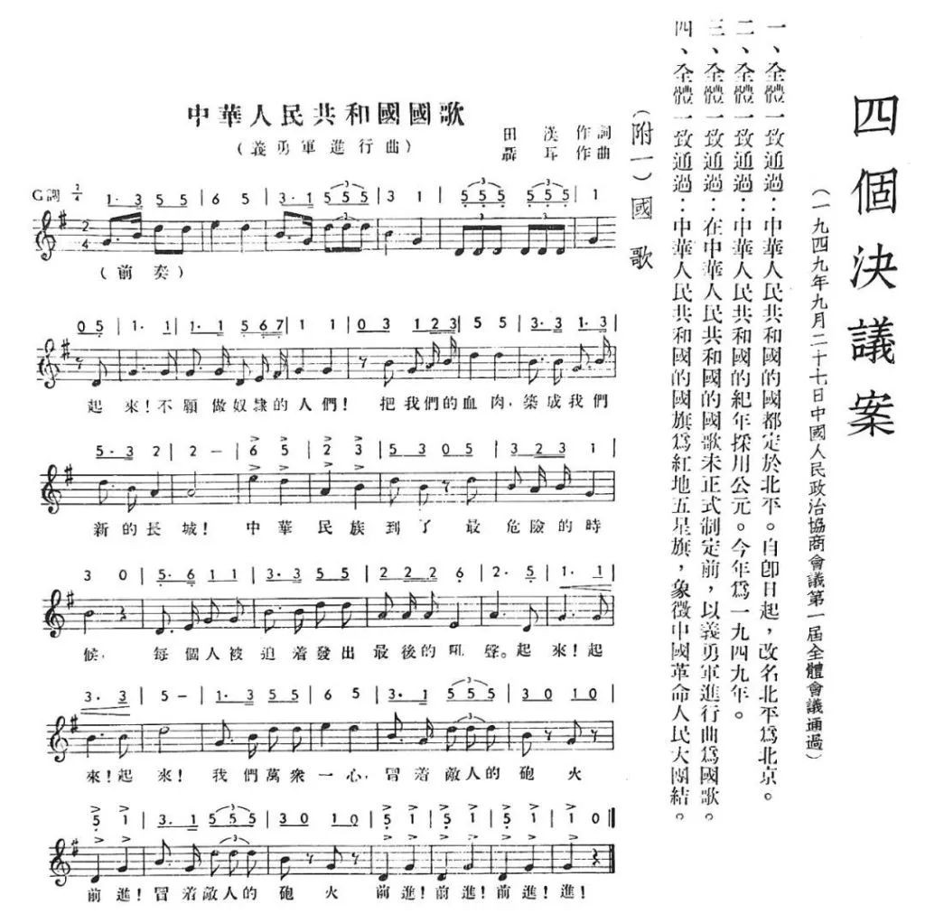 1949年9月27日,新政协召开全体会议。大会最后逐项表决通过了六项决议,其中一项是在中华人民共和国的国歌未正式制定前,以《义勇军进行曲》为代国歌。这个“代”,后来就成了“正式”。