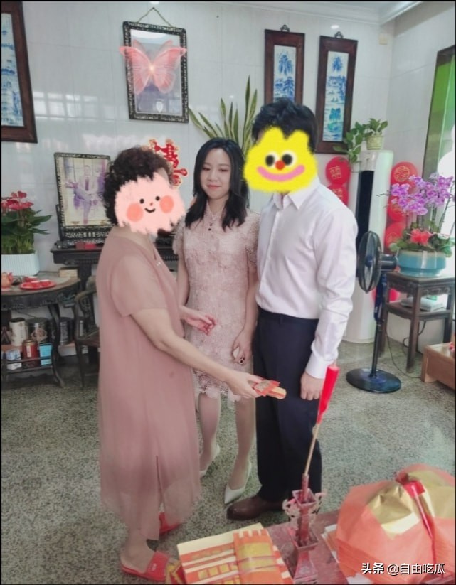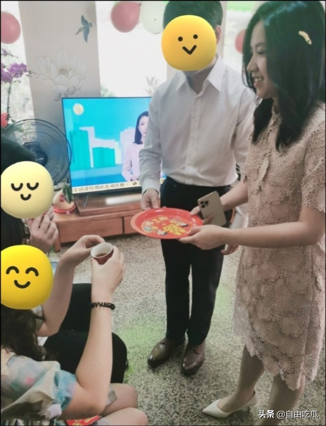 从陈安妮晒出的照片中,可以看出婚礼举办得较为简单,现场十分温馨,一个印着双喜的大红色端茶盘很是接地气。
