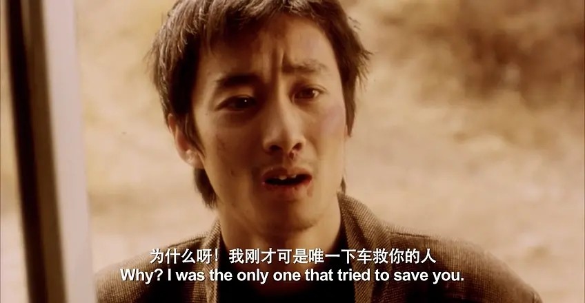 男主角看着女司机,大惑不解:“为什么呀!我刚才可是唯一下车救你的人。”