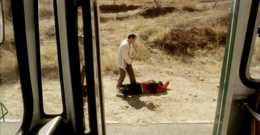 这时,被歹徒暴打后的男主角也慢慢挪到了车门前,正准备上车,但女司机愤怒地抬起头,叫他“滚”,并立马关了车门;随后,女司机从窗户处扔下男主角的行李,载着其它乘客重新上路了。