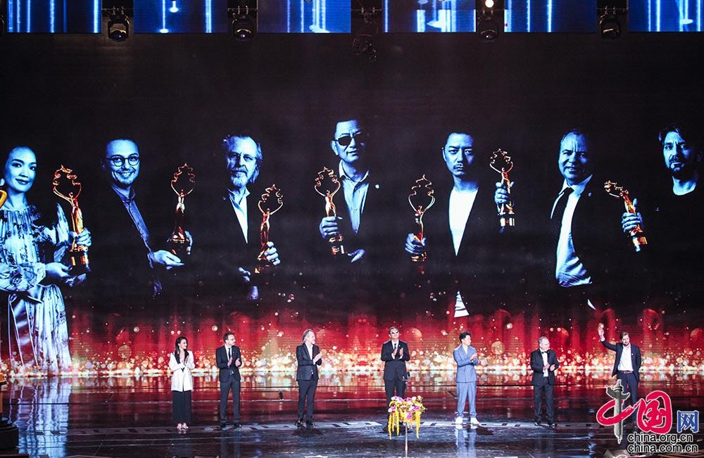 “天坛奖”评委会主席王家卫带领其他六位评委会成员,走上舞台。王家卫现场致辞,阐释他心目中的好电影标准。中国网记者 伦晓璇 摄