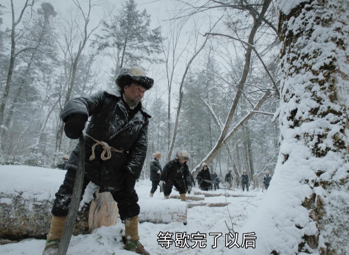 镜头一转,冰天雪地的林区正在进行伐木作业,工人们说话都冒着寒气,伐木工具只有铁锯,还总是不够用,人工作业条件异常艰苦。