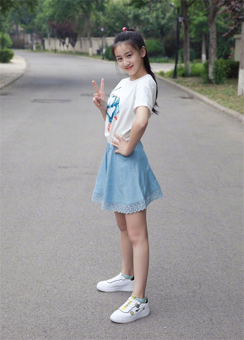12岁的森碟出落得亭亭玉立,穿着白T搭配浅色牛仔裙,简单又清爽,她左手叉腰右手比耶,看着镜头笑得很甜,妥妥的元气少女。她露出的大长腿笔直细长,让人不得不感叹这身高长得真快。