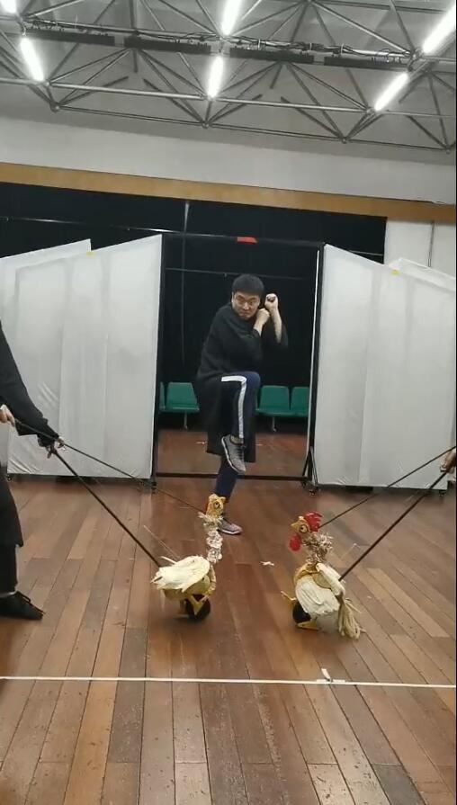 郭洪波透露,剧中只有十位演员,他们不仅要在不同的场景中饰演不同的角色,还要融入舞台换景,成为舞台环境的一部分,几乎每个演员都要承担四到五个角色和换景道具的功用。比如,开场处会飞的桌椅,拦路打斗的公鸡,被捆绑的猪,就都是由演员操控演绎完成的。这样的设计自然增加了舞台的灵动性和趣味性,但多造型、多场景的角色转换也给演员带来了大挑战。此外,剧组还特聘了两位舞蹈老师,专门负责剧中太极武术、肢体动作的培训和排演。