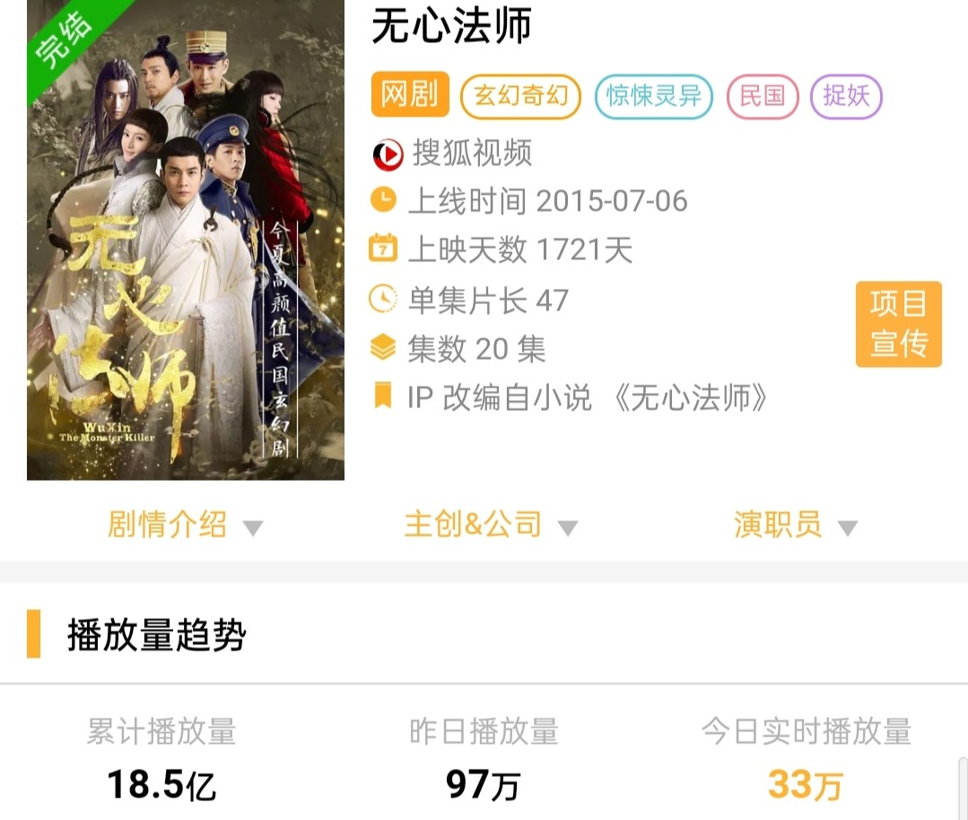 《无心法师》的热度在播出后持续发酵,谁也没有想到就是这样一部“三无”网剧,走出了先前的困境,众所周知《无心法师》是一部在近年来比较少见的民国玄幻题材的网剧,从题材上来说有着一定的基础,《无心法师》的主演也都是新人演员,其中饰演无心的韩东君、饰演岳绮罗的陈瑶都是唐人影视旗下的艺人,而这两人也因《无心法师》得热播成功让更多的观众认识到他们。