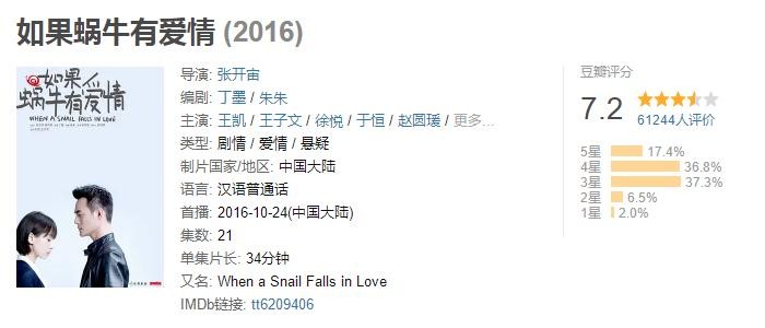 《如果蜗牛有爱情》是由企鹅影业和东阳正午阳光影视有限公司联合出品,张开宙执导,朱朱编剧,王凯、王子文、徐悦、于恒等主演的爱情推理剧。