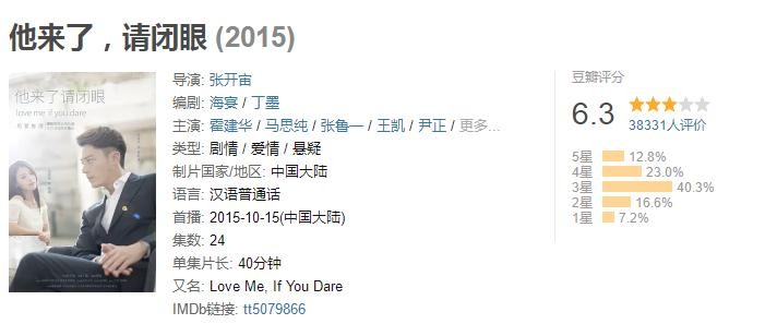 《他来了,请闭眼》是一部悬疑爱情剧,该剧由张开宙执导,东阳正午阳光影视有限公司制作剧集,霍建华、马思纯、张鲁一、王凯、章龄之、尹正主演。