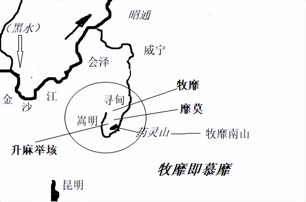 解释一下:牧靡县治所设在寻甸,寻甸在嵩明北部,药灵山在嵩明及寻甸交界处。所以被称为“牧靡南山”。但又说“山在县东北”,让读者摸不着头脑。其实,药灵山在嵩明坝子东北。也说明,牧靡县治所在寻甸,但县的主体还是嵩明。