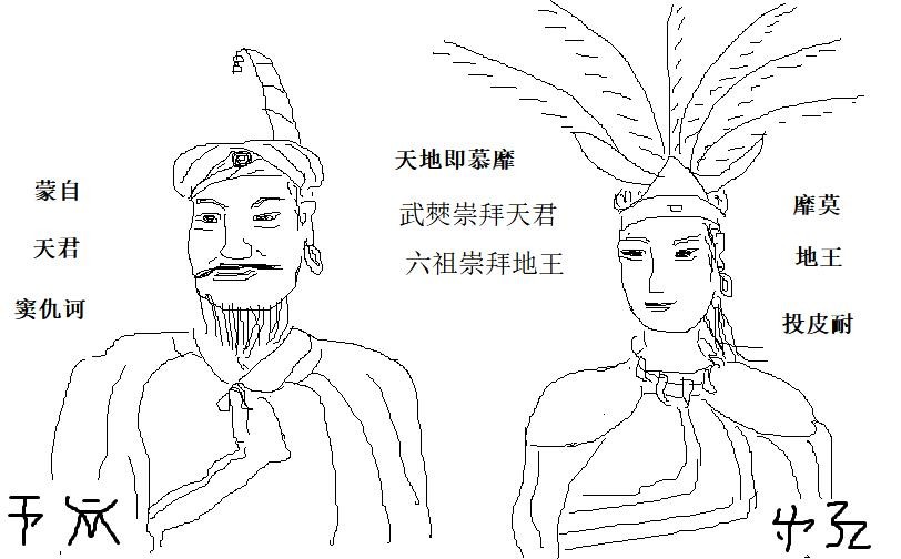夷人哲学里:父为天,母为地;天为白,地为黑。天君为男性,地王为女性。男女共同掌权,代表爷爷家及外公家双方一起享受王权。