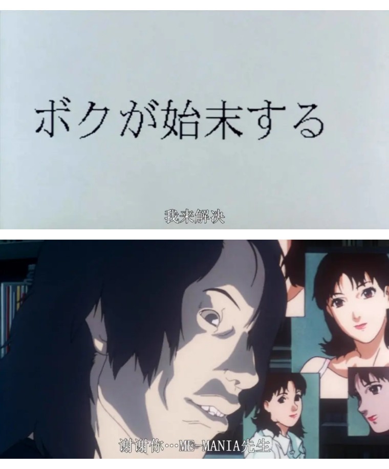 至于那个马脸铁粉“Me-Mania”,则是未麻内心混沌的标志,他跟踪未麻、保护未麻,也给未麻带来了恐惧和不安,甚至通过“未麻的部屋”网站,受到了留美的影响,要去刺杀作为演员的未麻,因为在他心中只有身为歌手的未麻才是未麻的本体,演员未麻不过是假货而已。