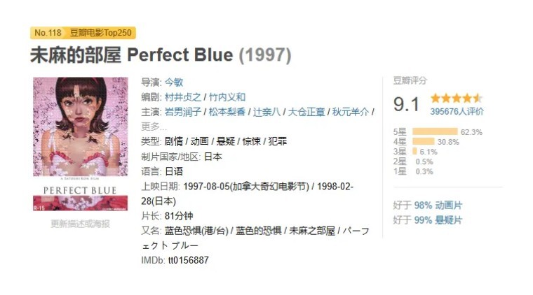 1997年7月在加拿大奇幻电影节上映的动画电影《未麻的部屋》,似乎并没有赢得像他所受赞誉一般的如山的票房狂潮,与他全球范围内区区几十万美元的票房形成鲜明对比的是,无论是在豆瓣还是IMDB,这部日本天才动画导演今敏的处女作皆获得了观众们的一致好评。