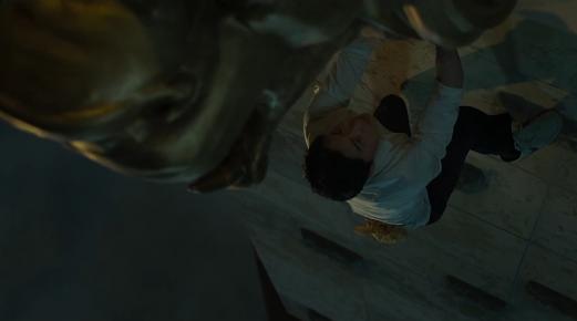 这时电视上播放了政府公告,说是直升机有限,又受到楼层高度影响,只能优先救助高层顶楼的人。勇南急中生智,砸碎酒店的玻璃,准备从外墙上爬到天台去。在一家人的殷切期待下,勇南宛如一位空中飞人,旋转,跳跃,有惊无险地跳到了对面。义珠也给他送来了空投,哦不,是粉笔头和爬山扣。勇南不愧是多年的攀岩爱好者,唰唰几下来到了最后一步,绳子却不够长了,他只好放弃这唯一的安全措施,看得我是手心出汗,提心吊胆。