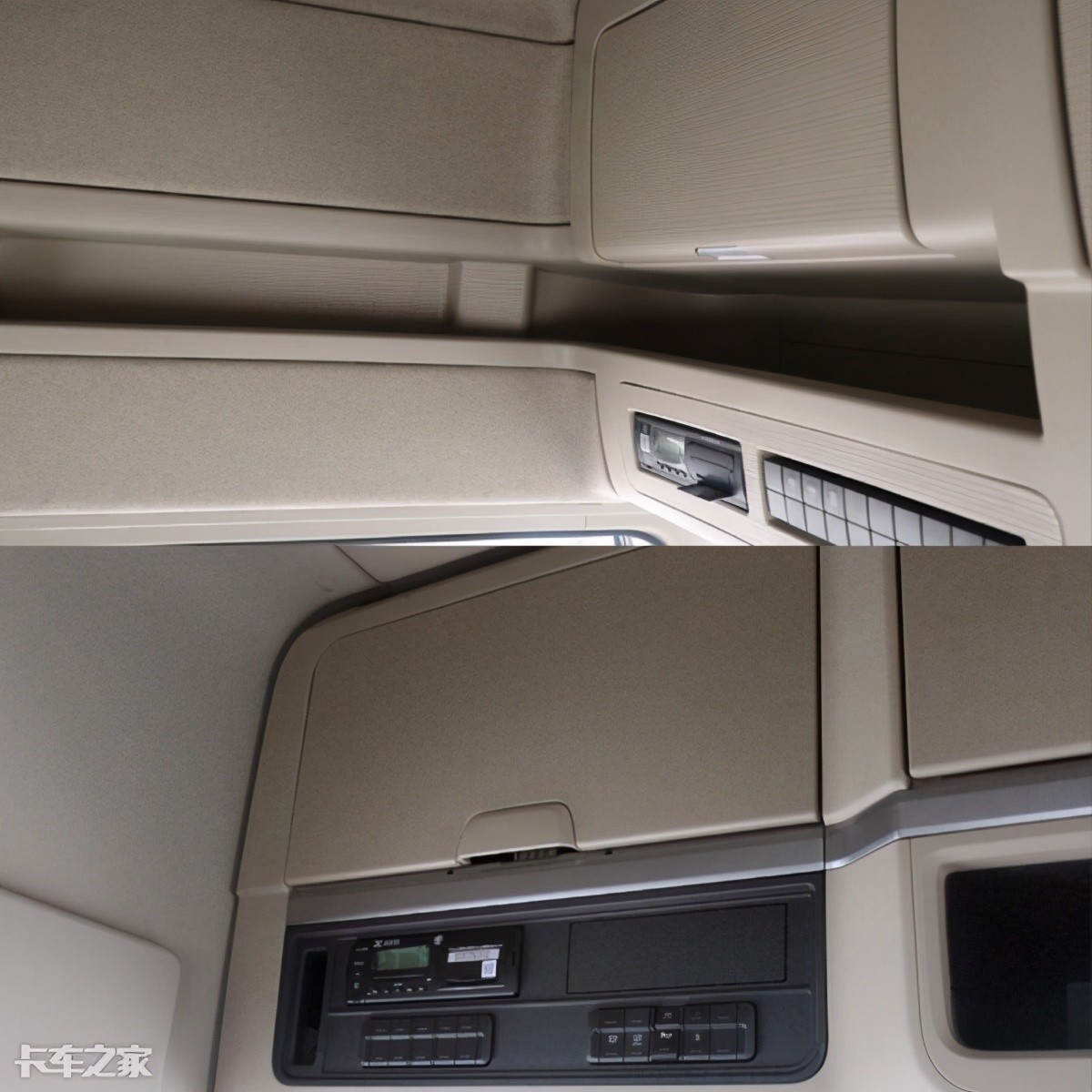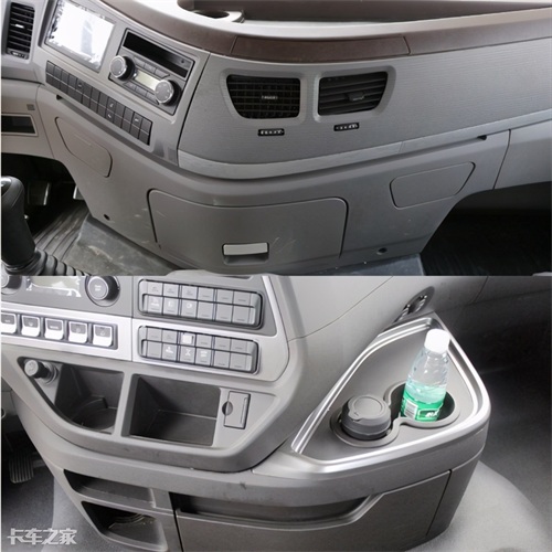 天龙旗舰中控台上大量浅灰色的配色使得其中控塑料感较强,中控台上的储物空间相对也比较少,与现在的主流重卡对比较没优势。现代创虎的中控台虽然也使用了大量塑料材质,但是其细节营造出来的质感就要比较高一点,而且中控台上分布了大大小小的储物空间,颜值与实用性兼得。