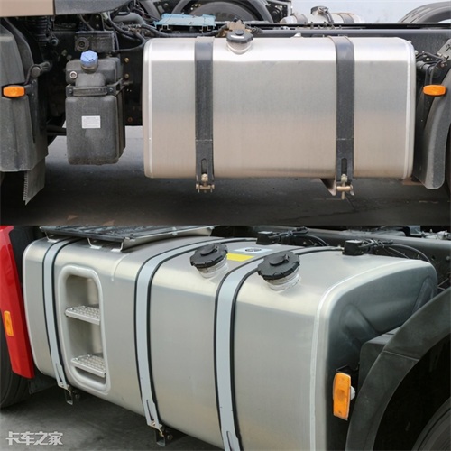 天龙旗舰搭载了650+250升的双油箱设计,车身左侧为650升容量油箱,车身右侧为250升的小容量油箱。现代创虎则是采用了790升的单侧双腔油箱,并且在油箱处设计了登车阶梯,提升了实用性的同时又获得了一个更好的完整美观性。