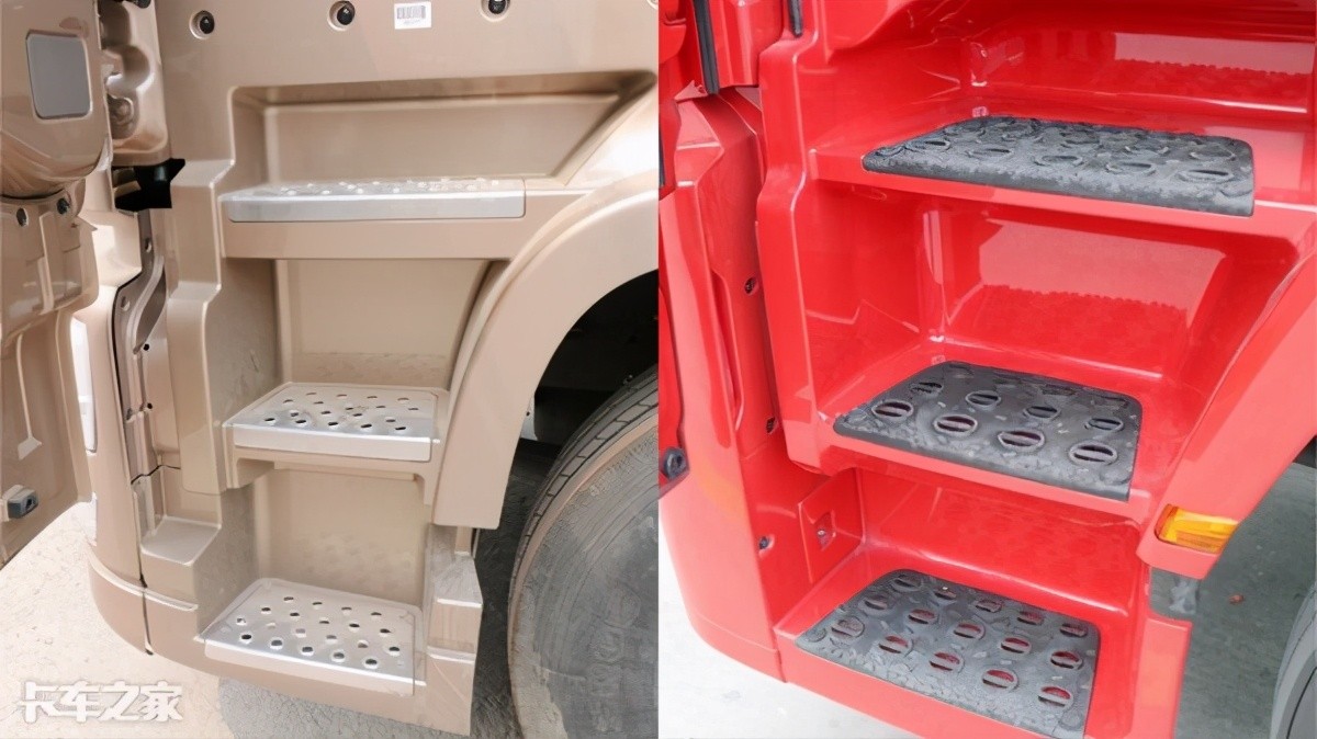 登车阶梯这块两车都做得不错,从下往上依次往里递进,驾驶员登车跨步就像走楼梯一样比较顺脚,天龙旗舰踏板所采用的材质较好一些,采用了铝合金镂空踏板,美观与实用性都有。