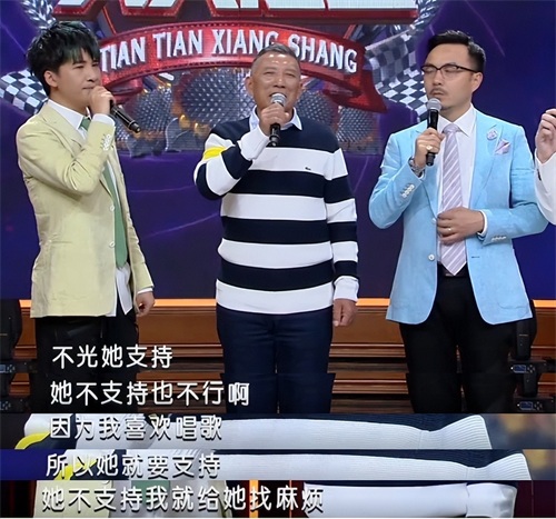 主持人问贾爸爸,女儿贾玲是否支持父亲来上节目,可爱的贾爸爸“耍赖”地表示,自己喜欢的事,女儿必须支持!
