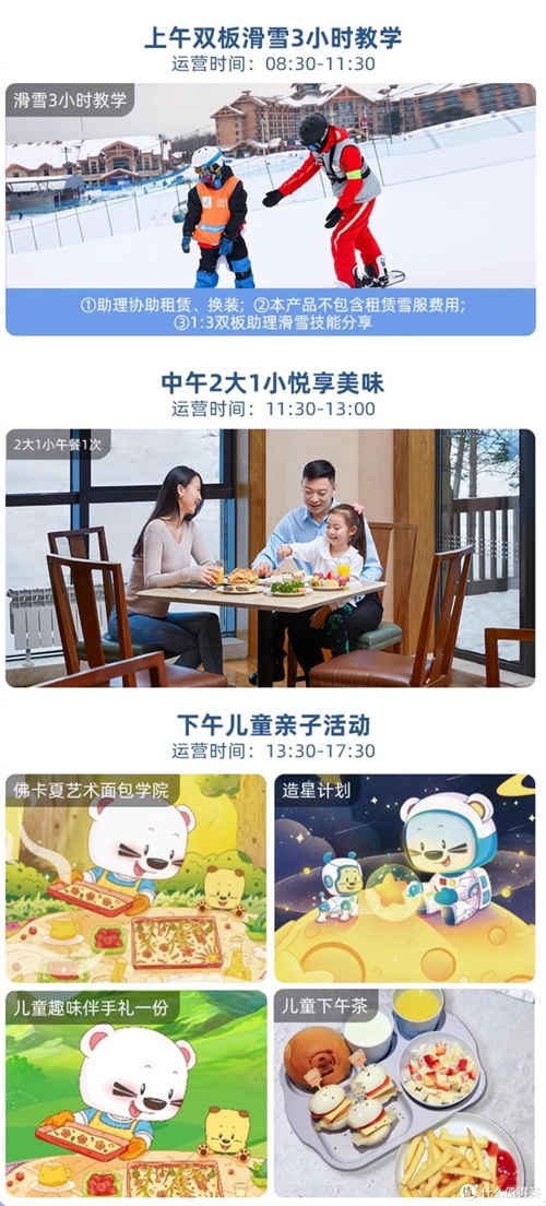 这个独立营,含上午3小时双板滑雪教学+2大1小午餐+亲子活动,正好适合我这种孩子本身会一些滑雪,轻度玩玩,只是请一位教练带一下的需求,