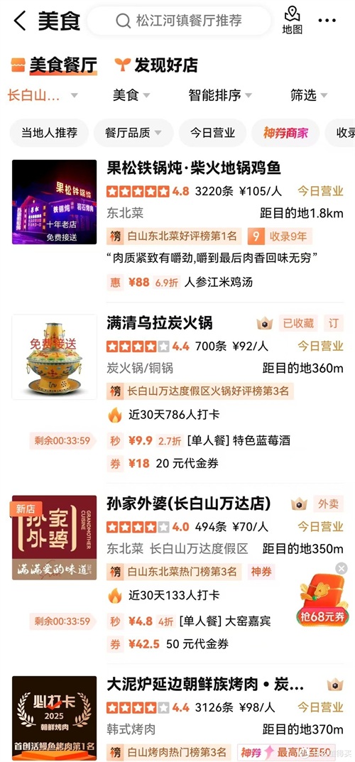 其他如东北铁锅炖、沈阳老边饺子、火锅、西餐、日料等等,整个度假区内和周边,总计上百家餐厅。