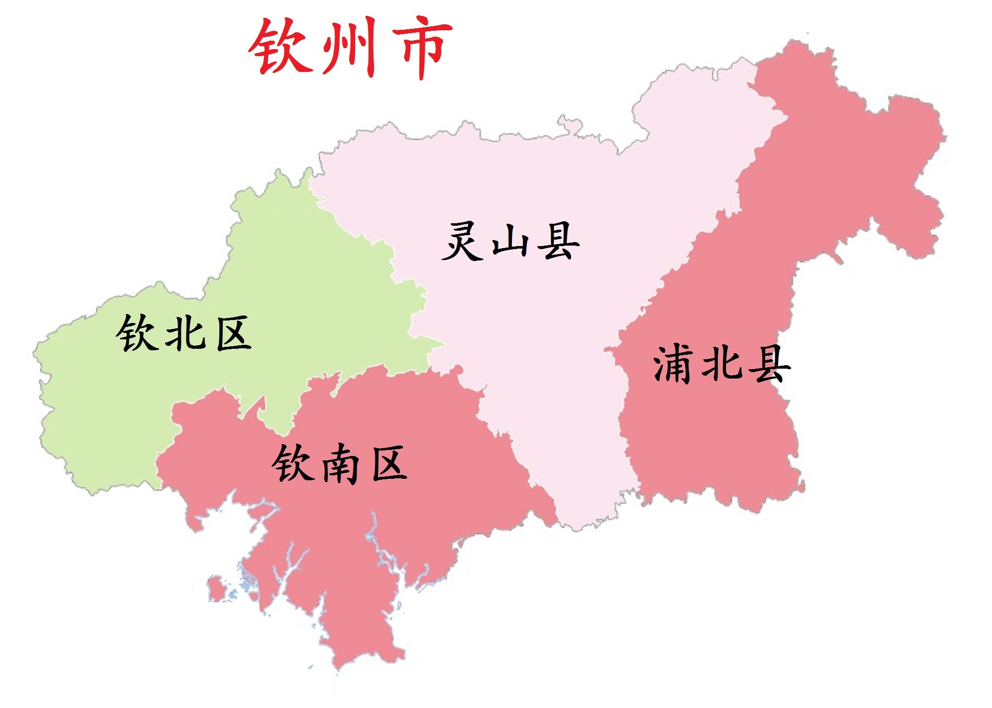 钦州市,市政府驻钦南区。地处广西壮族自治区南部沿海,南濒北部湾,西与防城港市交界,北与南宁市毗邻,东与北海市、玉林市相连。