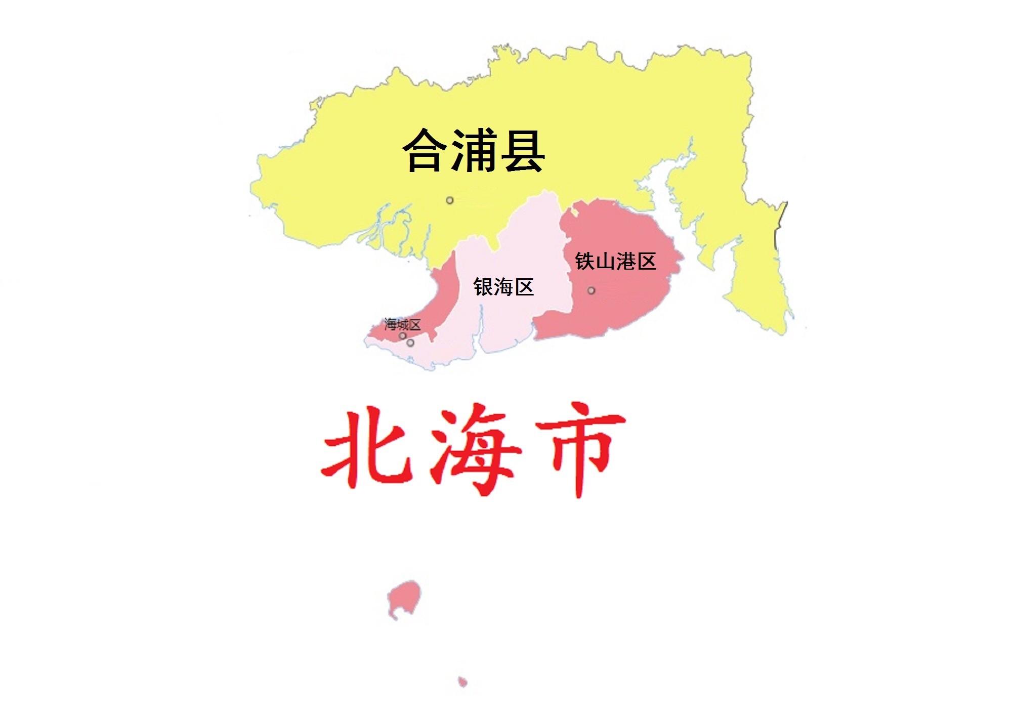 全市总面积3337平方千米,下辖3个区(海城区、银海区、铁山港区)、1个县 (合浦县)。截至2021年底,常住人口187.24万人。