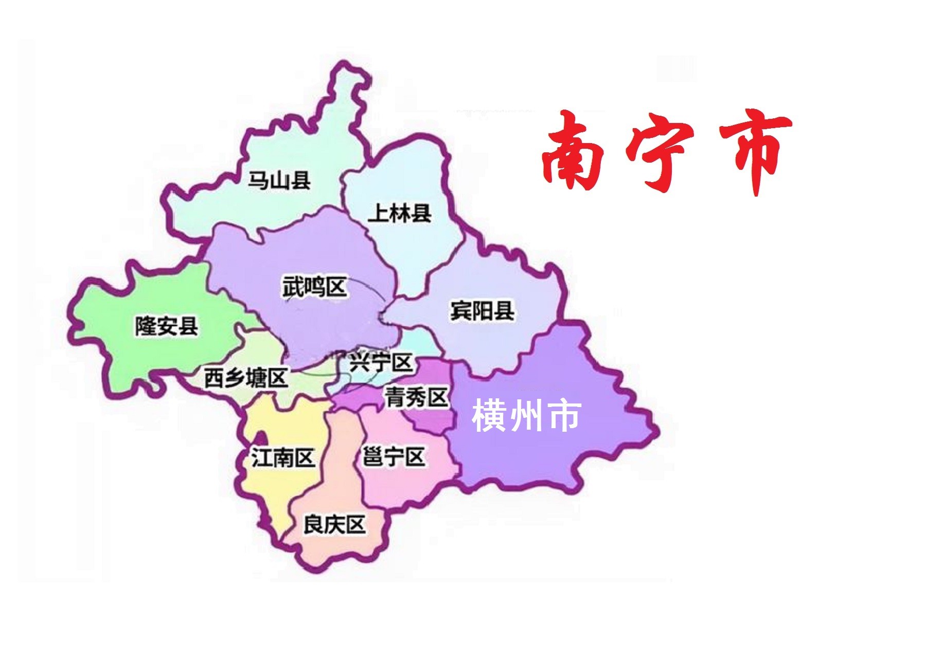 南宁市,广西壮族自治区首府,市政府驻青秀区。地处广西壮族自治区中南部,东临贵港市,南靠钦州市、防城港市,西依崇左市,西北与百色市交界,北邻河池市、来宾市。
