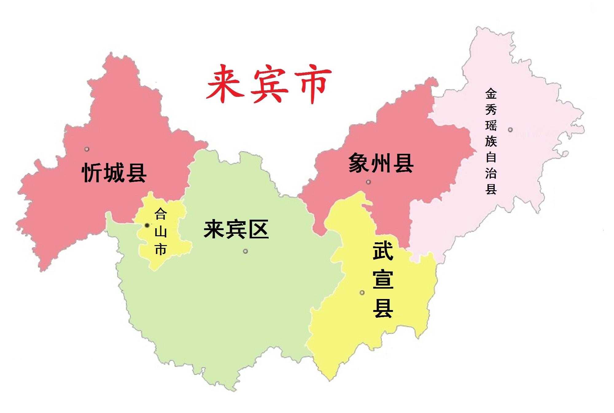 来宾市,市政府驻兴宾区。地处广西壮族自治区中部偏东北,东与梧州市毗邻,南与贵港市交界,西南与南宁市相连,西北与河池市交界,北与柳州市为邻,东北与桂林市接壤。