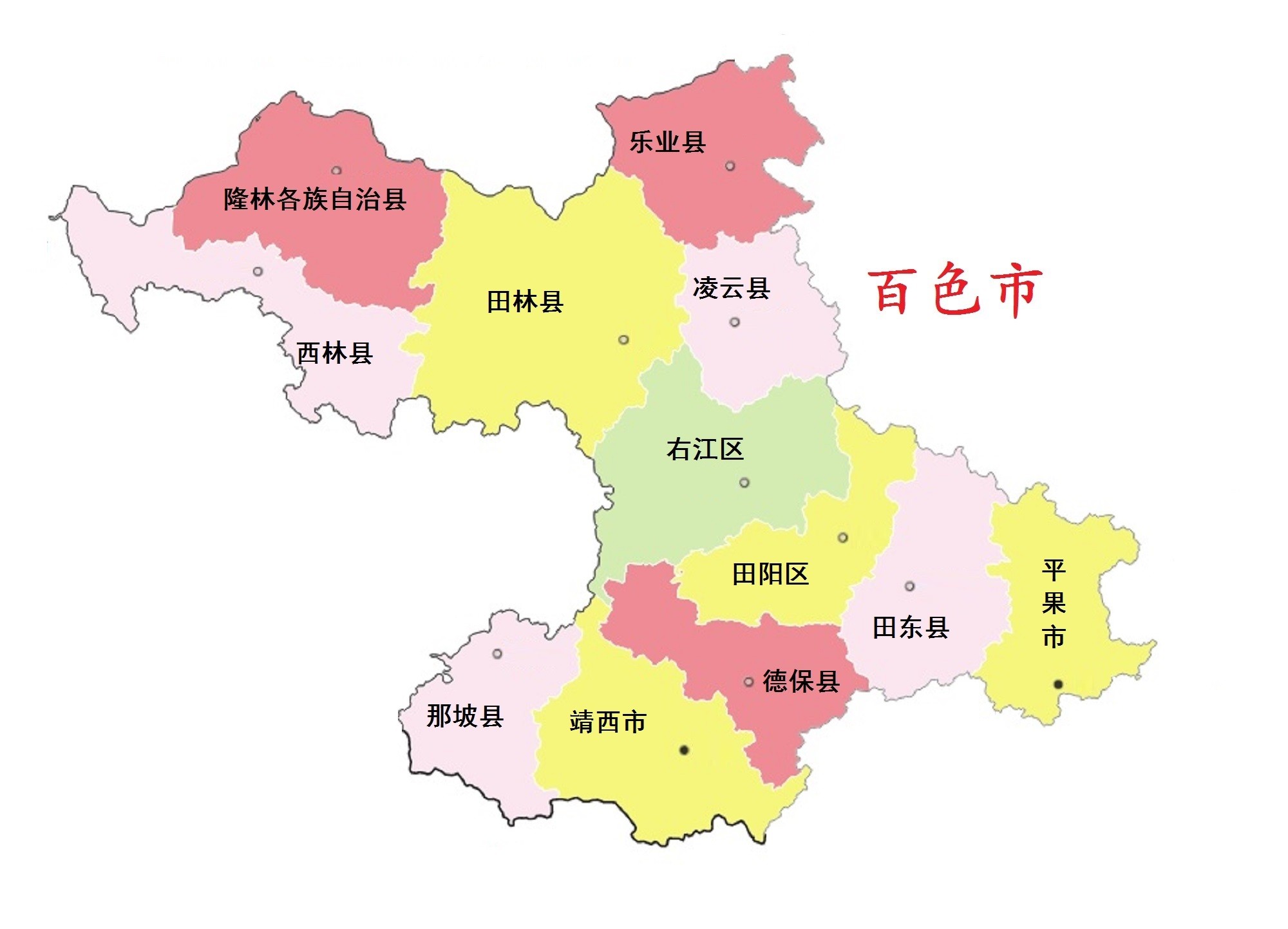 百色市,市政府驻右江区。位于广西壮族自治区西部,西与云南省文山州、曲靖市交界,北与贵州省黔西南州、黔南州毗邻,东连首府南宁市、河池市,东南接崇左市,南与越南接壤。