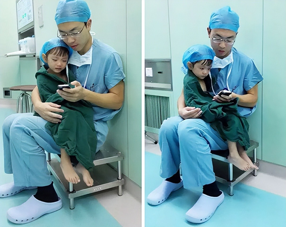 10:两岁小女孩在心脏手术前,主治医生平静地抱着小女孩安抚她。