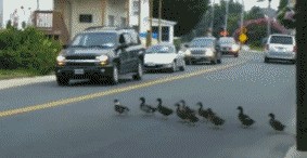 14:一群鸭子过马路,行驶到此的车辆主动停下来等它们通过。
