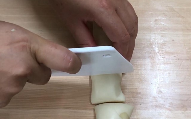 第五步:把擀好的长方形面皮卷起来,搓紧实后切剂子(剂子不用太大);然后把剂子的两头捏紧,再擀成皮子