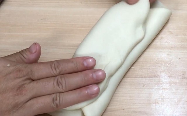 第四步:把擀好的面皮,三等份折好,擀成长方形;再把擀好的长方形面皮继续三等份折好,同样擀成长方形的面皮
